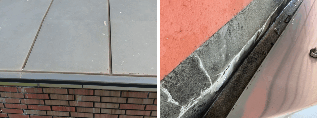 散水とサーモグラフィーを組み合わせて行った、今回の調査でいくつかの雨漏りの原因となる劣化症状が見受けられました。今回の調査では外壁と屋上防水の接続部における防水機能の劣化です。具体的には、経年による温度変化や紫外線の影響でシーリング材に剥離が生じ、そこから雨水が建物内部へ浸入していました。