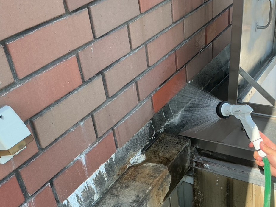 実際の雨天を再現するため、劣化が疑われるシーリング部分や接合部に水を散布し、建物内部に侵入があるかを確認しました。