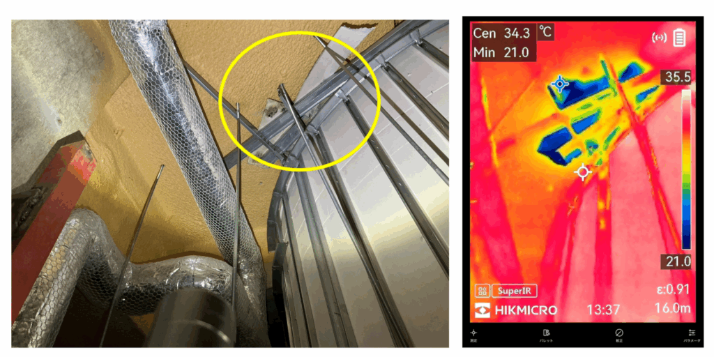 サーモグラフィーによる温度解析では、この接合部から侵入した水分が建物内部でどのように広がっているかも確認でき、単なる表面的な問題ではなく、建物の構造部分にまで影響が及んでいることが判明しました。