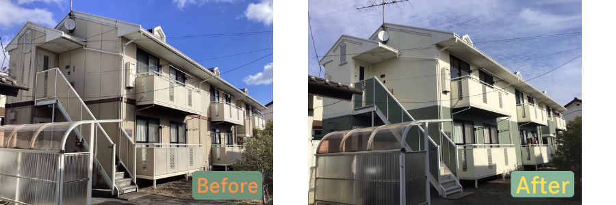 建物の形状や立地条件に合わせた色選びを行うことで、明るさ・清潔感・落ち着きなどの印象を自在にコントロールでき、入居希望者の目を引く建物づくりにつながります。