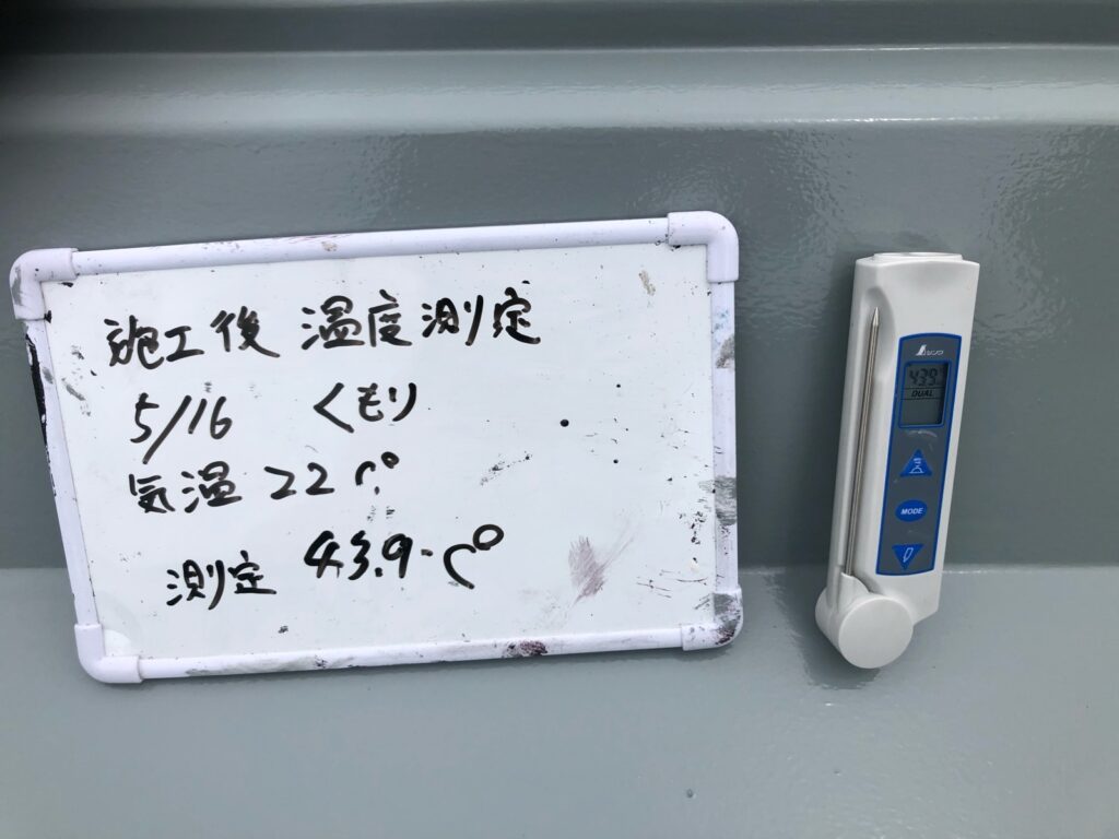 今回の測定は、仙台市内の工場に設置された金属屋根(折板屋根)で実施しました。金属屋根は熱を吸収しやすく、日差しが強い日は特に高温になりやすい特性があります。そのため、遮熱効果が最も活きる場所といえます。測定は表面温度計を使用し、いずれも気温22℃という同条件下で比較を行いました。施工前後で天候の違いはありますが、気温が同じであるため効果の比較としては十分な判断材料となります。