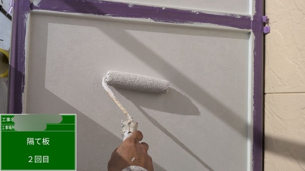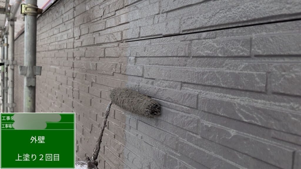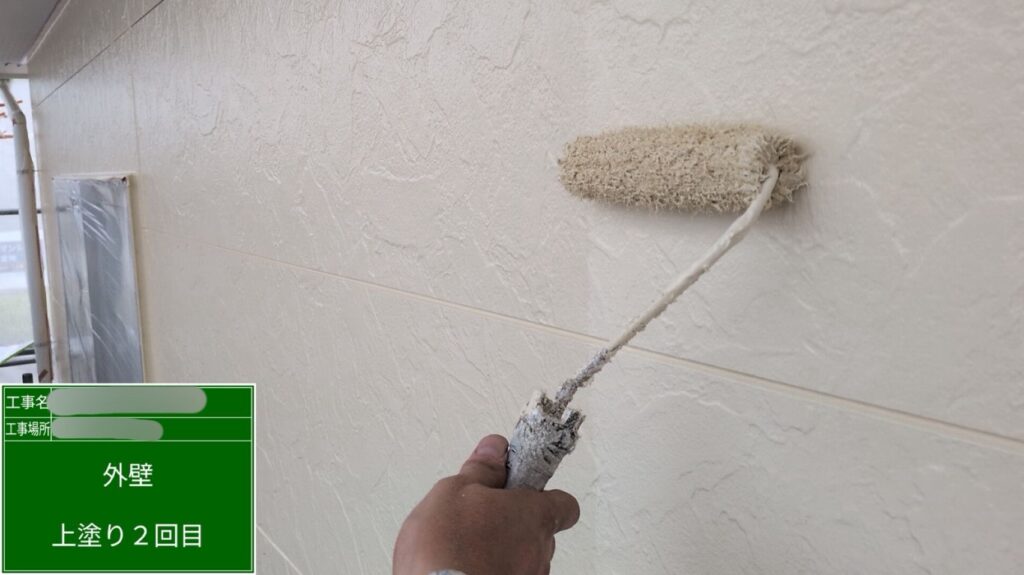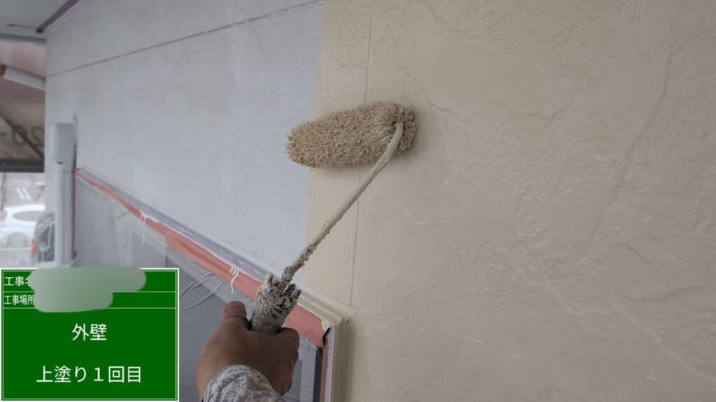上塗り1回目(中塗り)では、色味と塗膜厚を均一に整え、建物全体の印象を大きく左右します。