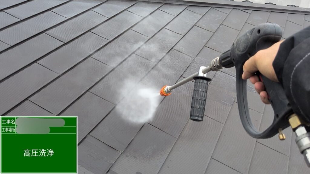 まずは高圧洗浄により、屋根表面に付着した汚れや旧塗膜の劣化粉を丁寧に除去します。