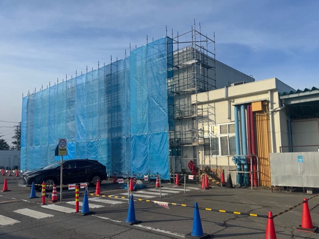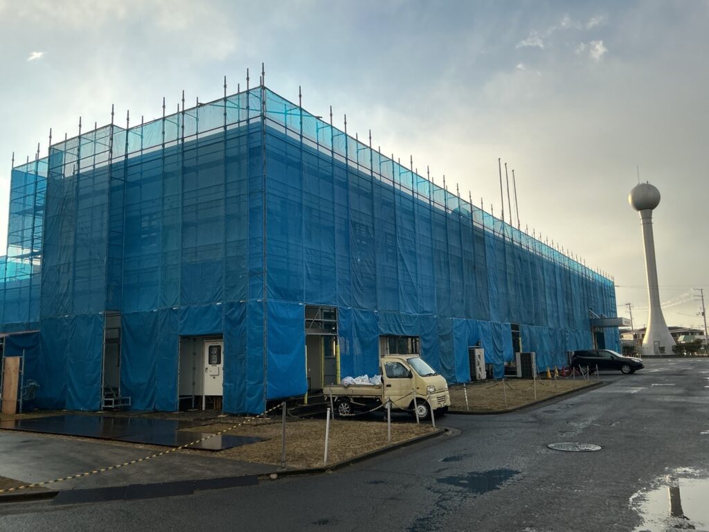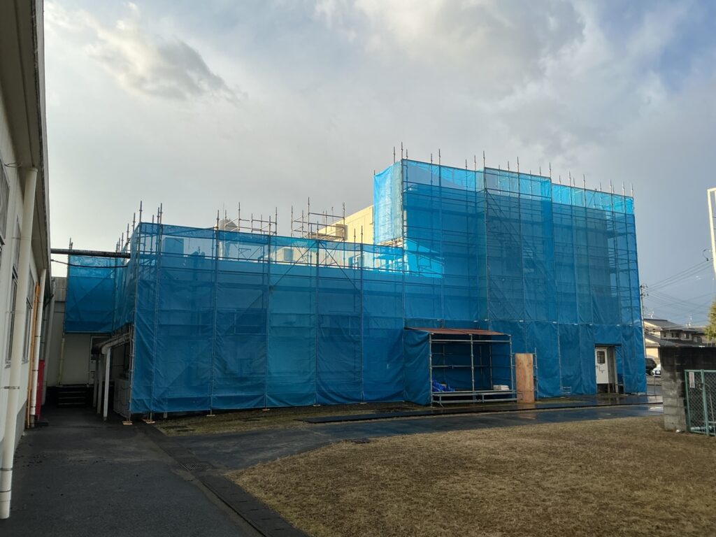 足場を組む際には、塗料等の飛散を防止するメッシュシートも張ります。