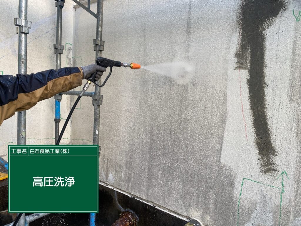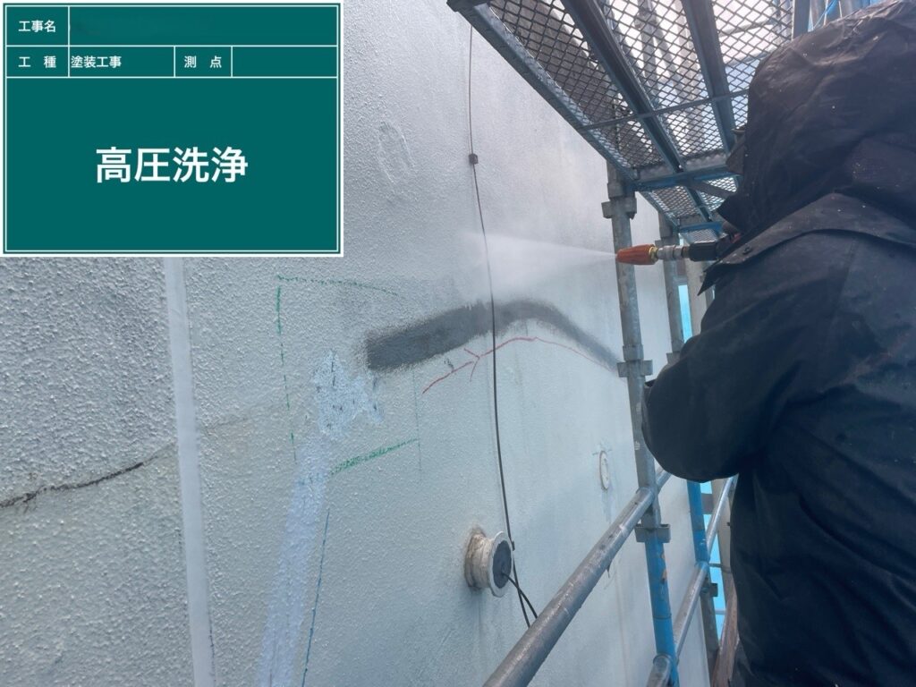 高圧洗浄によって汚れや古い塗膜を除去する作業です。