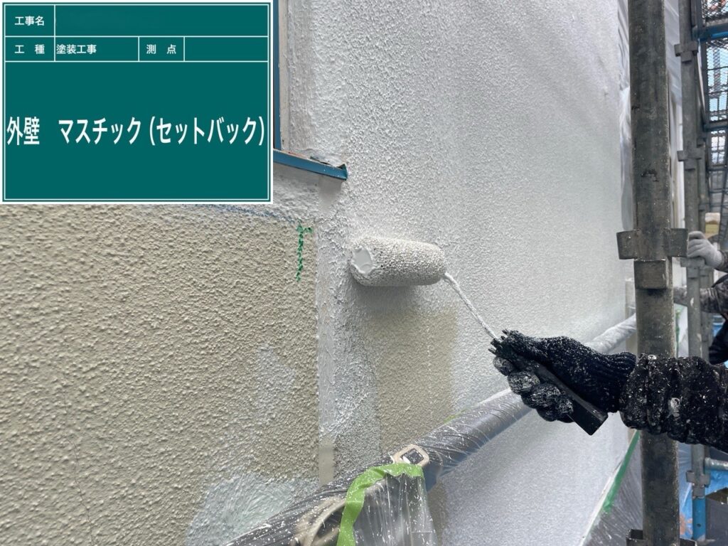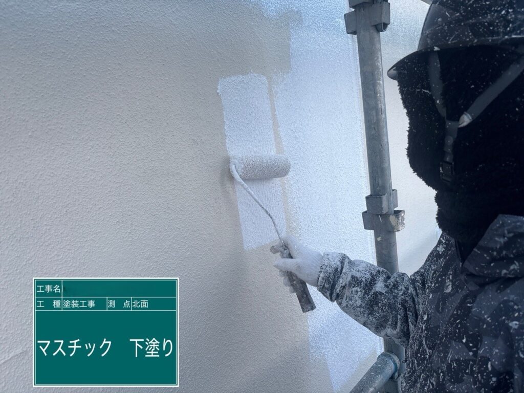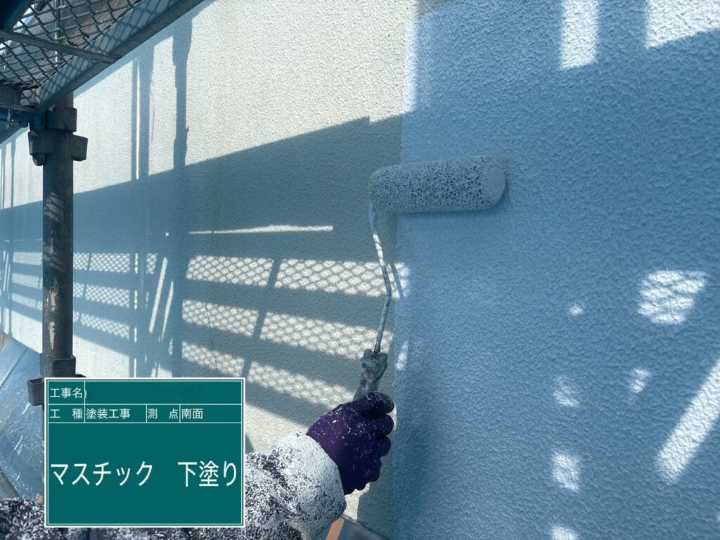 下塗りでは、専用のマスチックローラーを使用し、塗料を厚みを持たせてしっかりと塗布します。