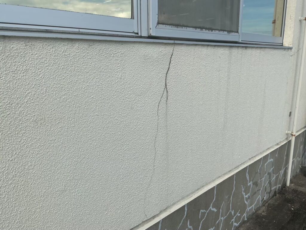 外壁全体に汚れの付着が見られ、また複数箇所にクラックが確認された状態でしたが、下地処理にて丁寧に補修を行い、塗装を施しました。